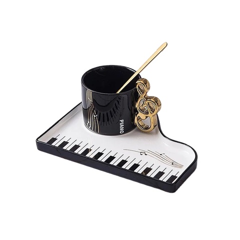 Juego de taza de café y platillo de piano Blanco y negro de cerámica de regalo único
