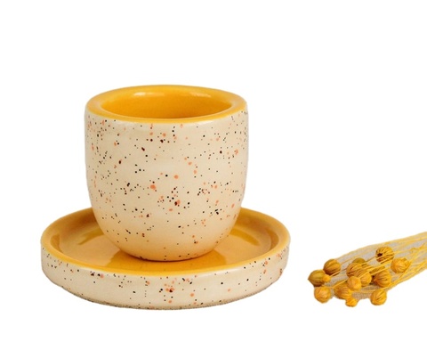 Tazza di caffè maculata gialla e piattino tazza Latte in ceramica fatta a mano